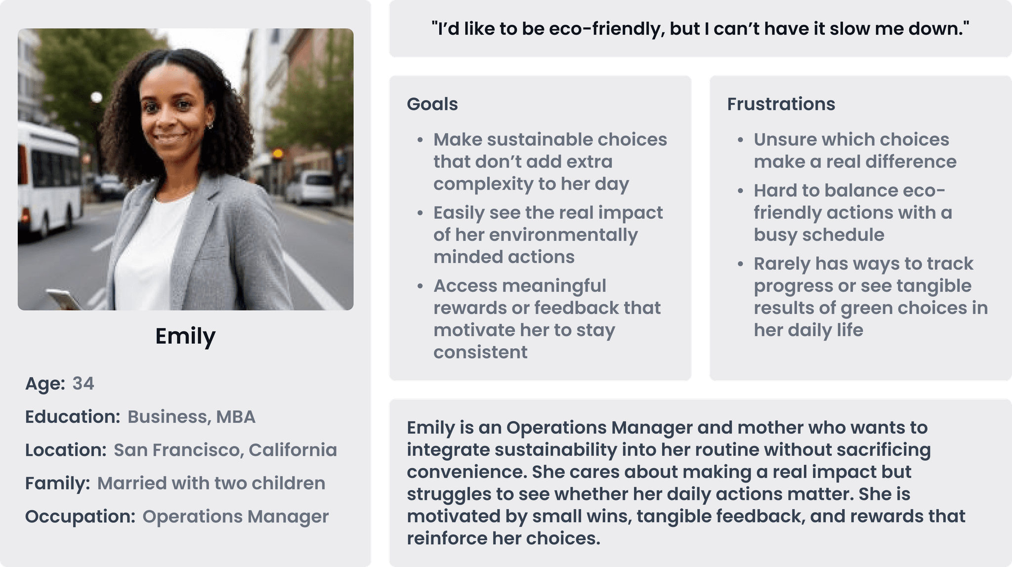 Emily wants to act on her environmental values but often struggles to understand whether her daily choices make a difference. She juggles various responsibilities while balancing sustainable habits. When her impact isn’t clear, she tends to fall back on familiar routines.