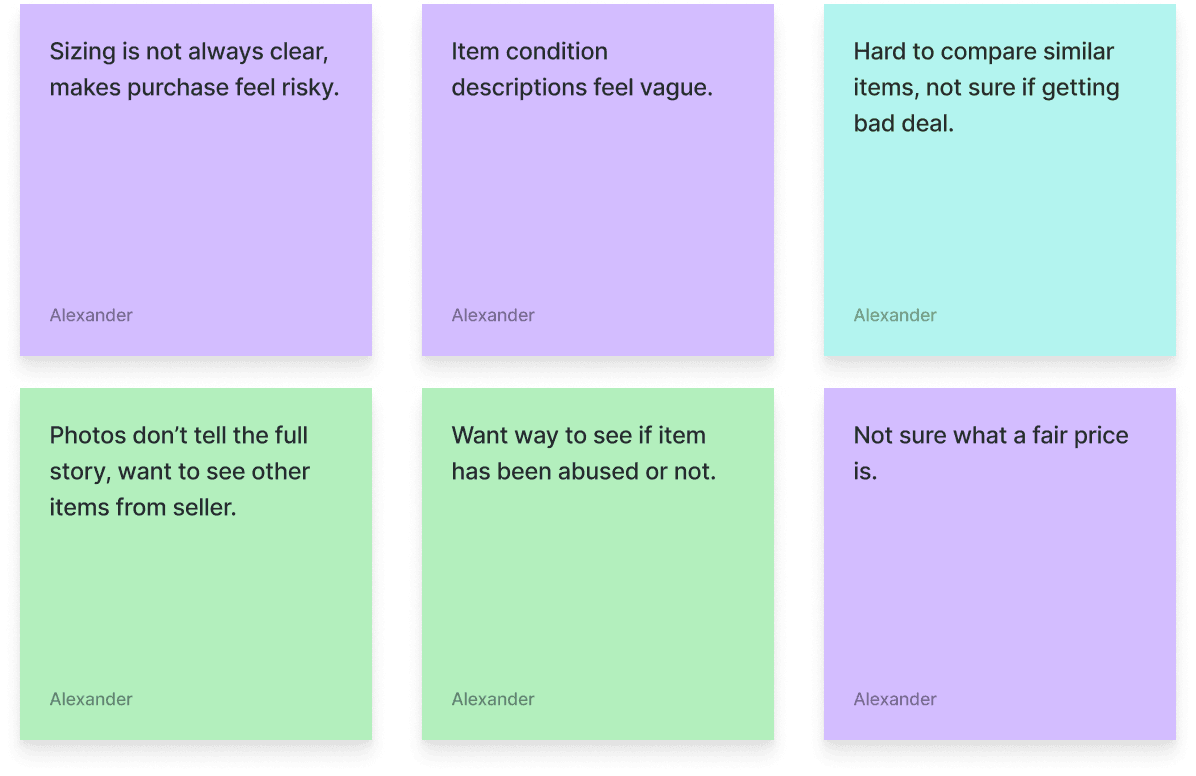 Chosen from a broader set of design challenges, six interviews were conducted with parents to understand how they buy and sell children’s clothing secondhand. The research focused on identifying friction points, parent priorities, and concerns related to resale.