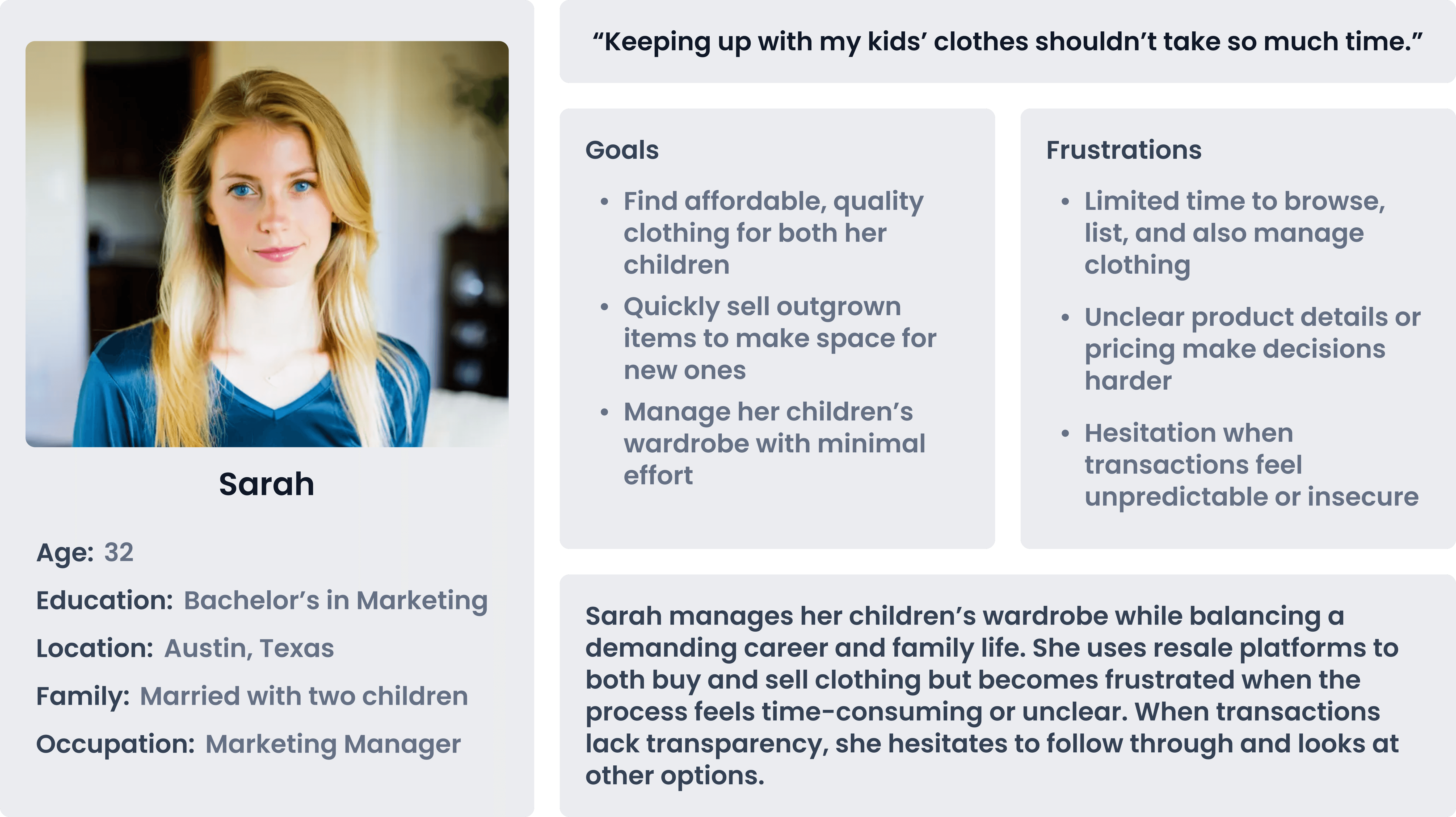 Sarah wants to keep up with her children’s wardrobes without adding complexity to her routine. She balances a demanding career and family life while buying and selling clothing. If the resale process feels time-consuming or difficult to predict, she is likely to disengage.